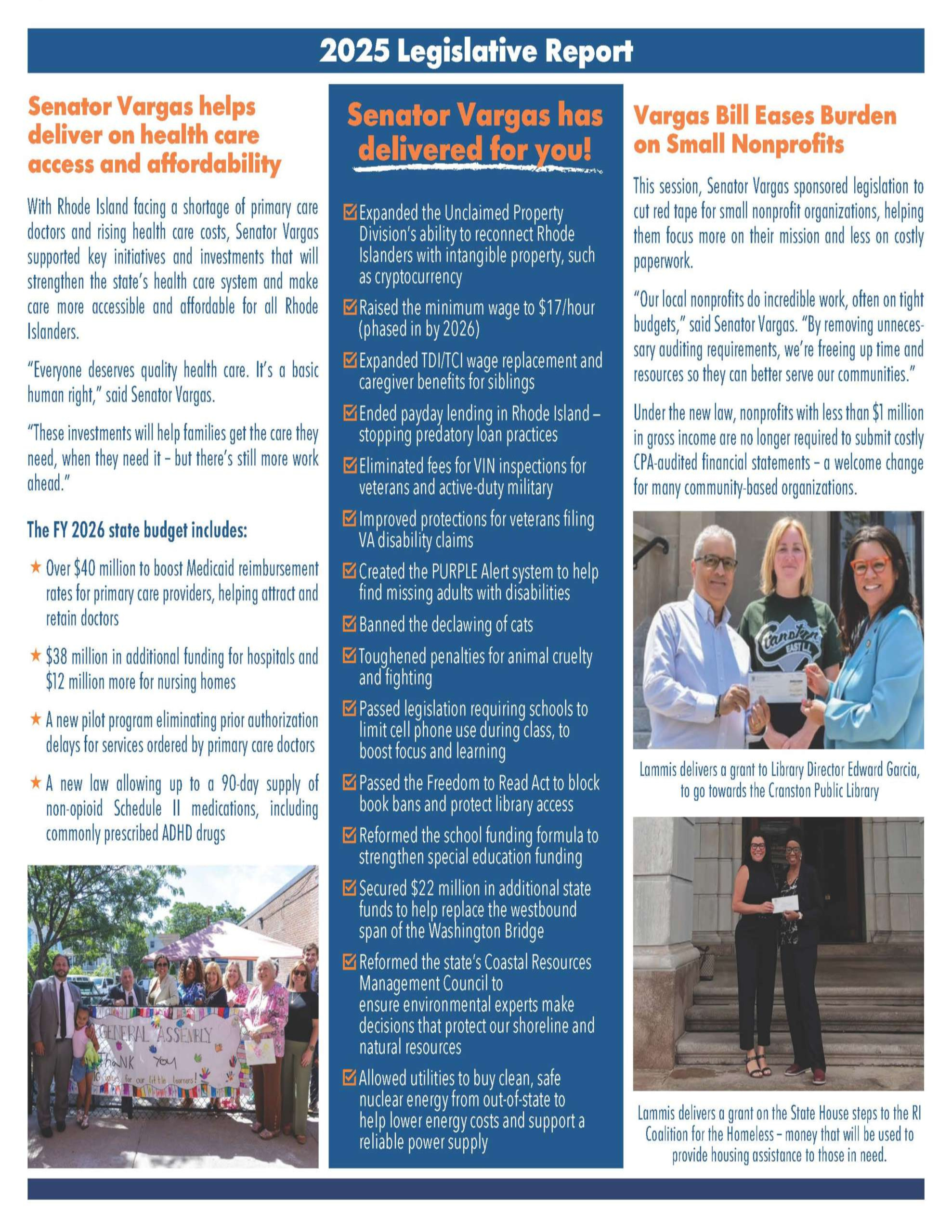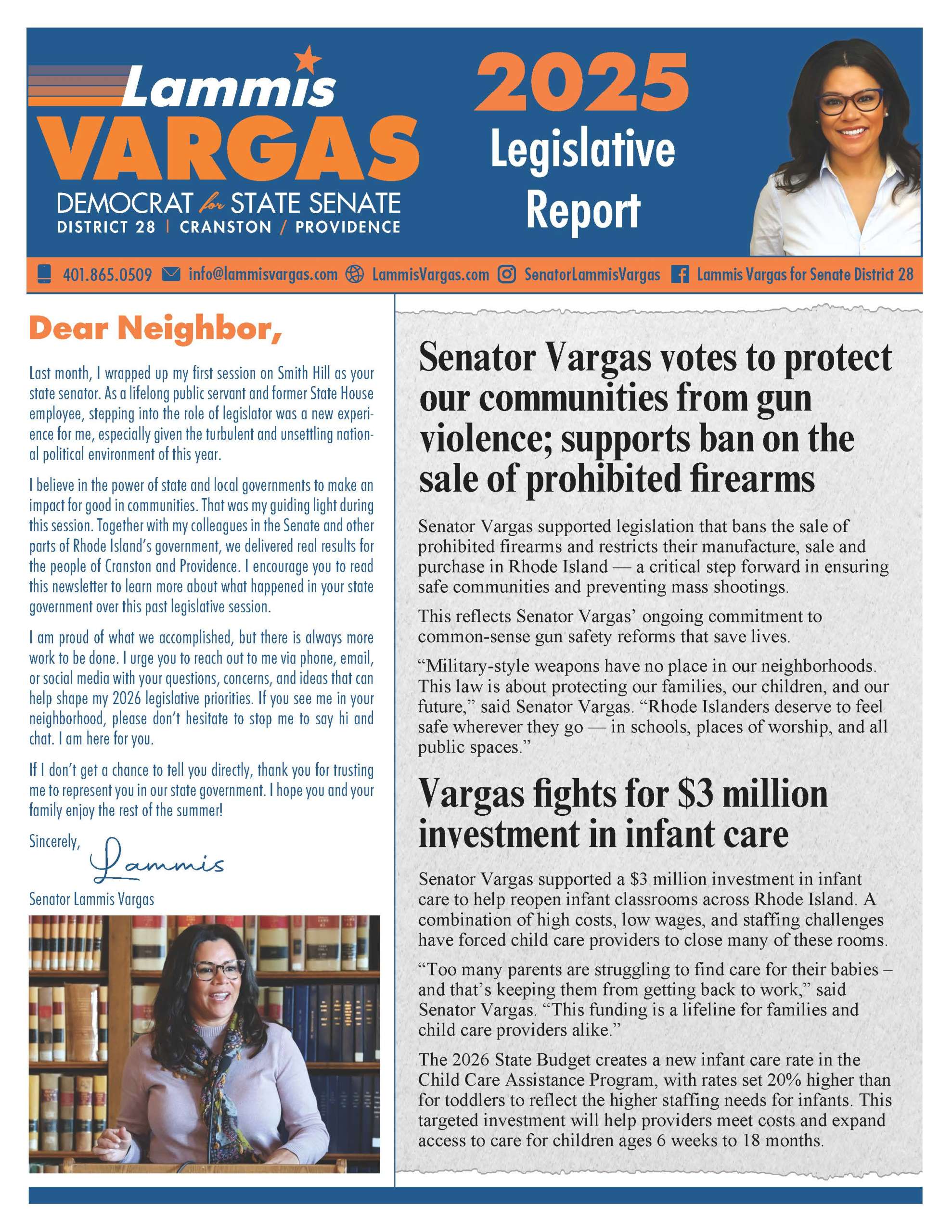 In 2025, Senator Lammis J. Vargas completed her first legislative session representing District 28 at the Rhode Island State House. As a lifelong public servant and former State House employee and City Councilmember, stepping into the role of legislator was a new experience for me, especially given the turbulent and unsettling current national political environment. Together with my colleagues in the Senate and other parts of Rhode Island’s government, we delivered real results for the people of Cranston and Providence.
